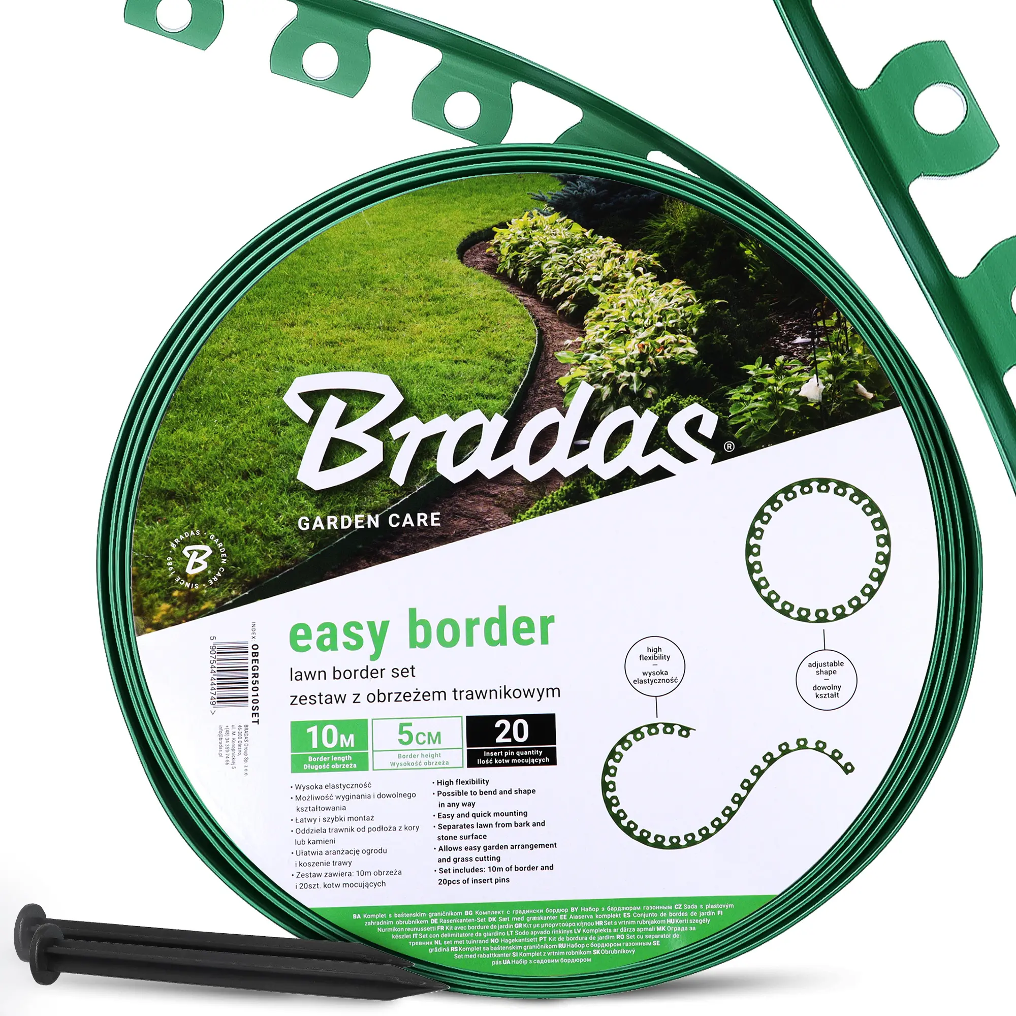 Elastyczne obrzeże trawnikowe Easy Border 50 mm x 10 m zielony i 20 x Kotwa mocująca 18cm