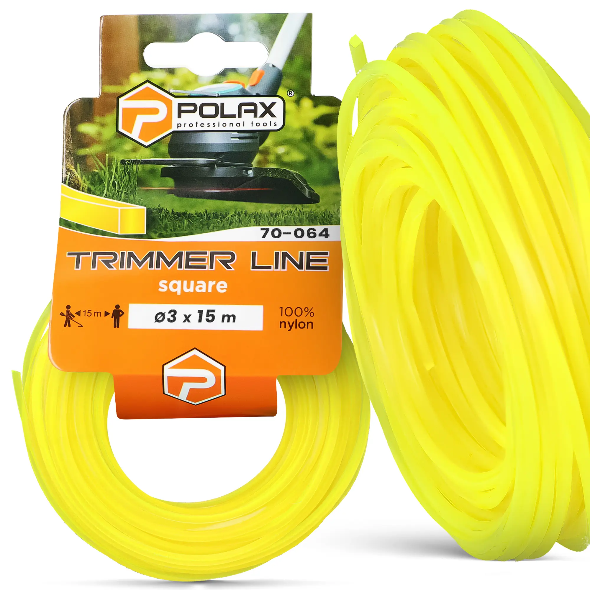 Nylon użyty do produkcji cechuje się elastycznością, która chroni przed pękaniem, a Kwadratowa kształt zapewnia agresywność niezbędną do walki z twardą roślinnością. Intensywny Żółty kolor wykończenia ułatwia kontrolę nad zasięgiem koszenia. Całość została zaprojektowana tak, by 3 mm x 15 m odpowiadał standardom rynkowym i pasował do większości popularnych głowic.