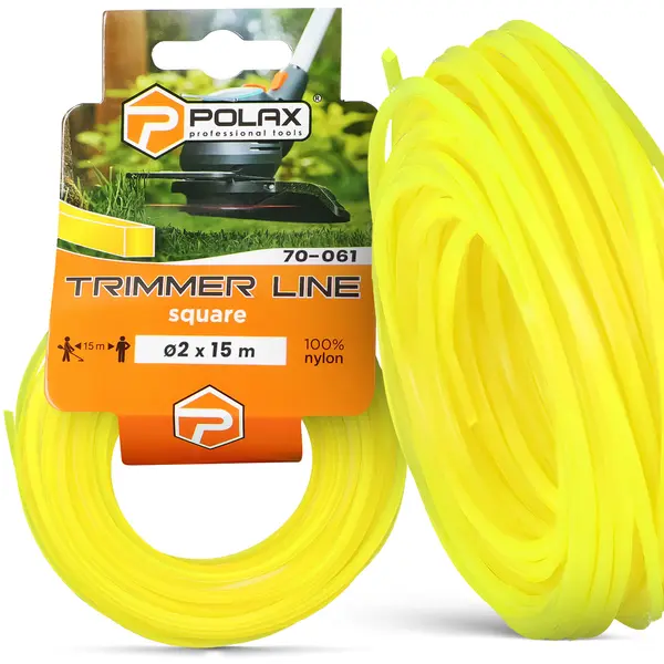 Nylon użyty do produkcji cechuje się elastycznością, która chroni przed pękaniem, a Kwadratowa kształt zapewnia agresywność niezbędną do walki z twardą roślinnością. Intensywny Żółty kolor wykończenia ułatwia kontrolę nad zasięgiem koszenia. Całość została zaprojektowana tak, by 2 mm x 15 m odpowiadał standardom rynkowym i pasował do większości popularnych głowic.