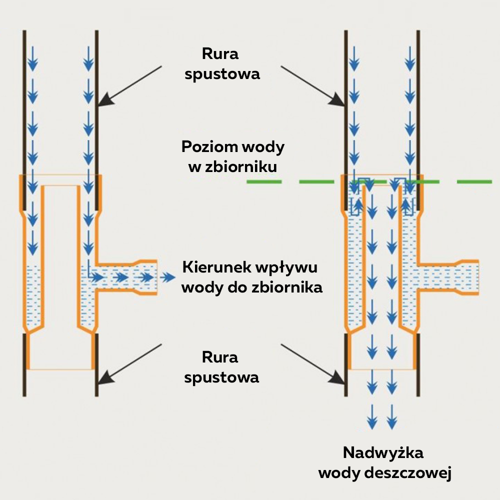 Poprawne działanie odzyskiwacza wody deszczowej zależy przede wszystkim od jego prawidłowego montażu na rurze spustowej instalacji rynnowej. Dzięki temu możliwe jest prawidłowe odprowadzanie wody do specjalnego zbiornika, aż do momentu, gdy ten nie zostanie całkowicie zapełniony. Kiedy tak się staje, a opady nie ustają, woda kierowana jest do kanalizacji burzowej lub na grunt, gdzie naturalnie wsiąka.