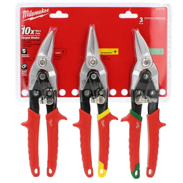 Szukasz wysokiej jakości nożyc do cięcia blachy? Profesjonalny zestaw nożyc Milwaukee pozwoli Ci przyciąć metalowe elementu do dowolnego kształtu. Komplet zawiera nożyce lewe, prawe i proste, dzięki czemu będziesz gotowy na każdą ewentualność.
