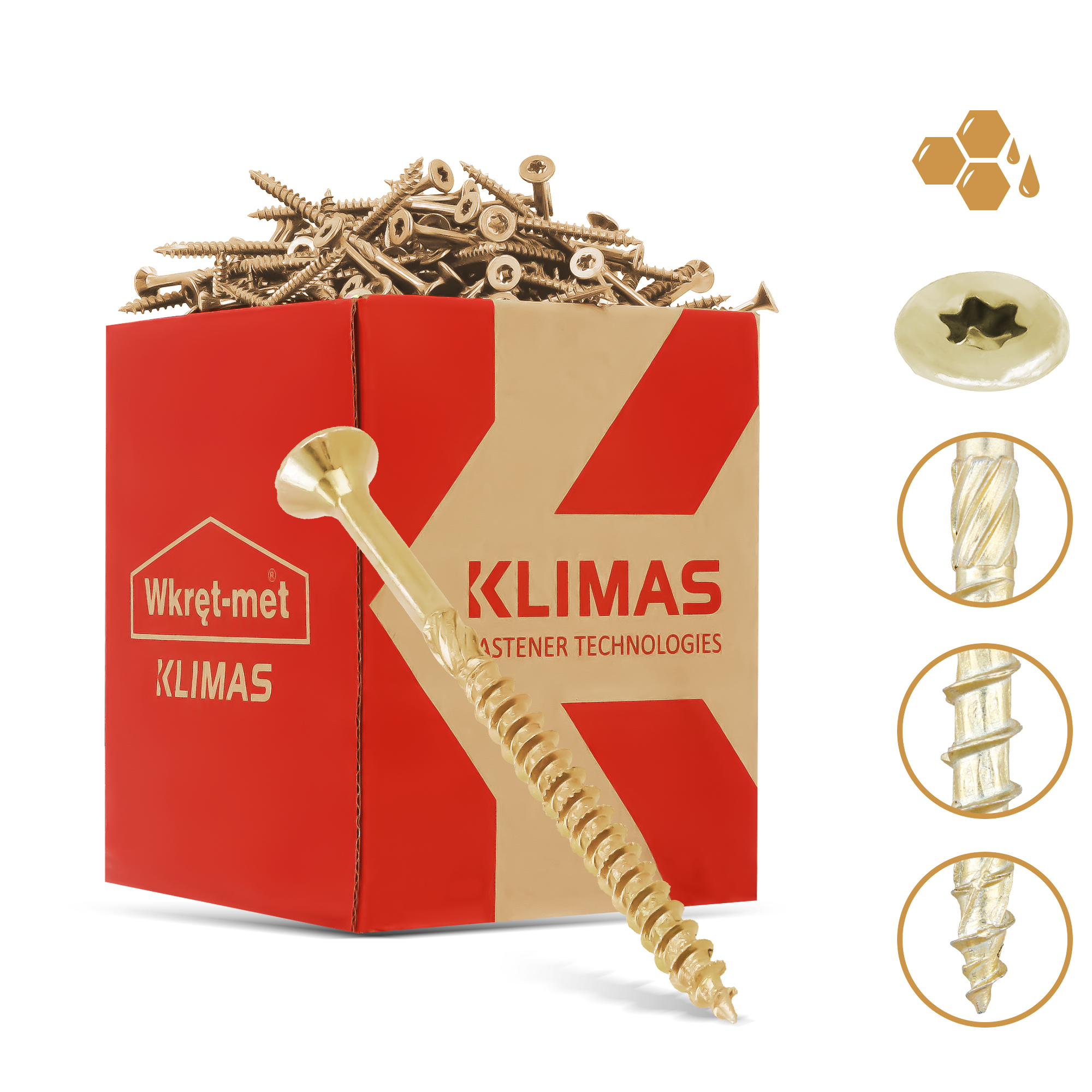 Frez rozwierający umieszczony w połowie długości śruby poszerza otwór i zmniejsza opór materiału o około 20%. Dzięki temu wkręt łatwiej zagłębia się w drewnie. Stożkowy łeb wyposażony w specjalne wypustki zapewnia estetyczne wykończenie, bez wystających krawędzi.