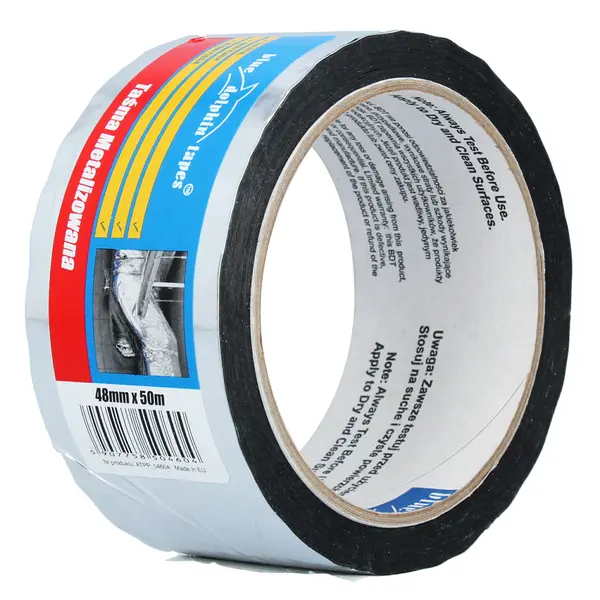Taśma metalizowana została wykonana z polipropylenu pokrytego cienką warstwą aluminium oraz klejem na bazie kauczuku. Produkt jest wyjątkowo odporny i pozwala na rozciąganie. Dzięki temu możesz dokładnie dopasować ułożenie taśmy.
