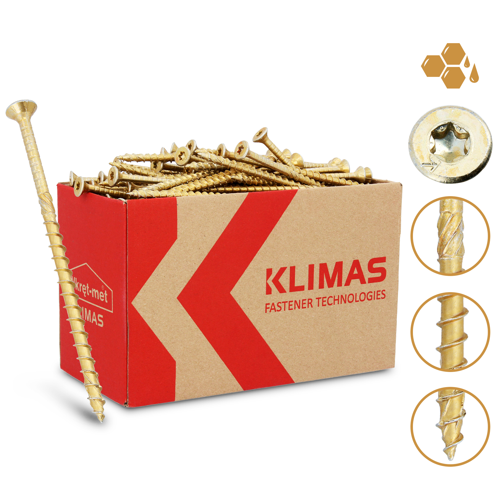 Frez rozwierający umieszczony w połowie długości śruby poszerza otwór i zmniejsza opór materiału o około 20%. Dzięki temu wkręt łatwiej zagłębia się w drewnie. Stożkowy łeb wyposażony w specjalne wypustki zapewnia estetyczne wykończenie, bez wystających krawędzi.