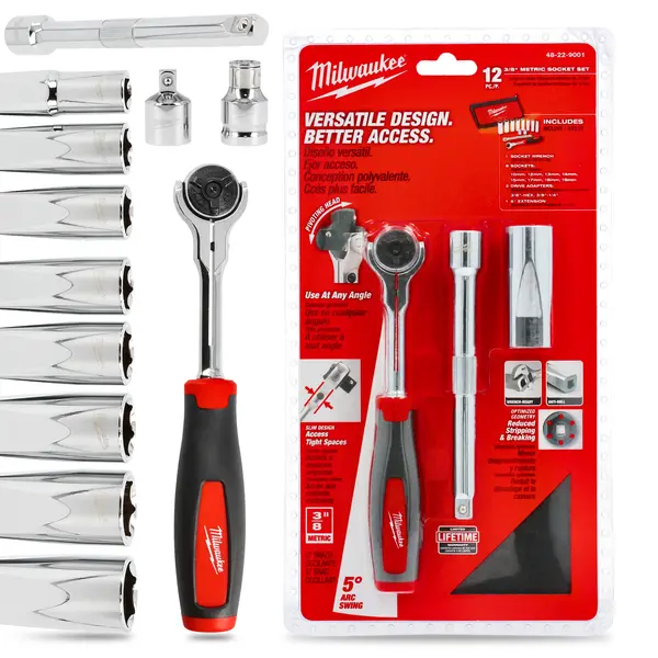 | Skład zestawu | Grzechotka 3/8", 8 szt. nasadek 3/8", Uchwyt do bitów, Adapter kwadrat 1/4″, Przedłużka |
