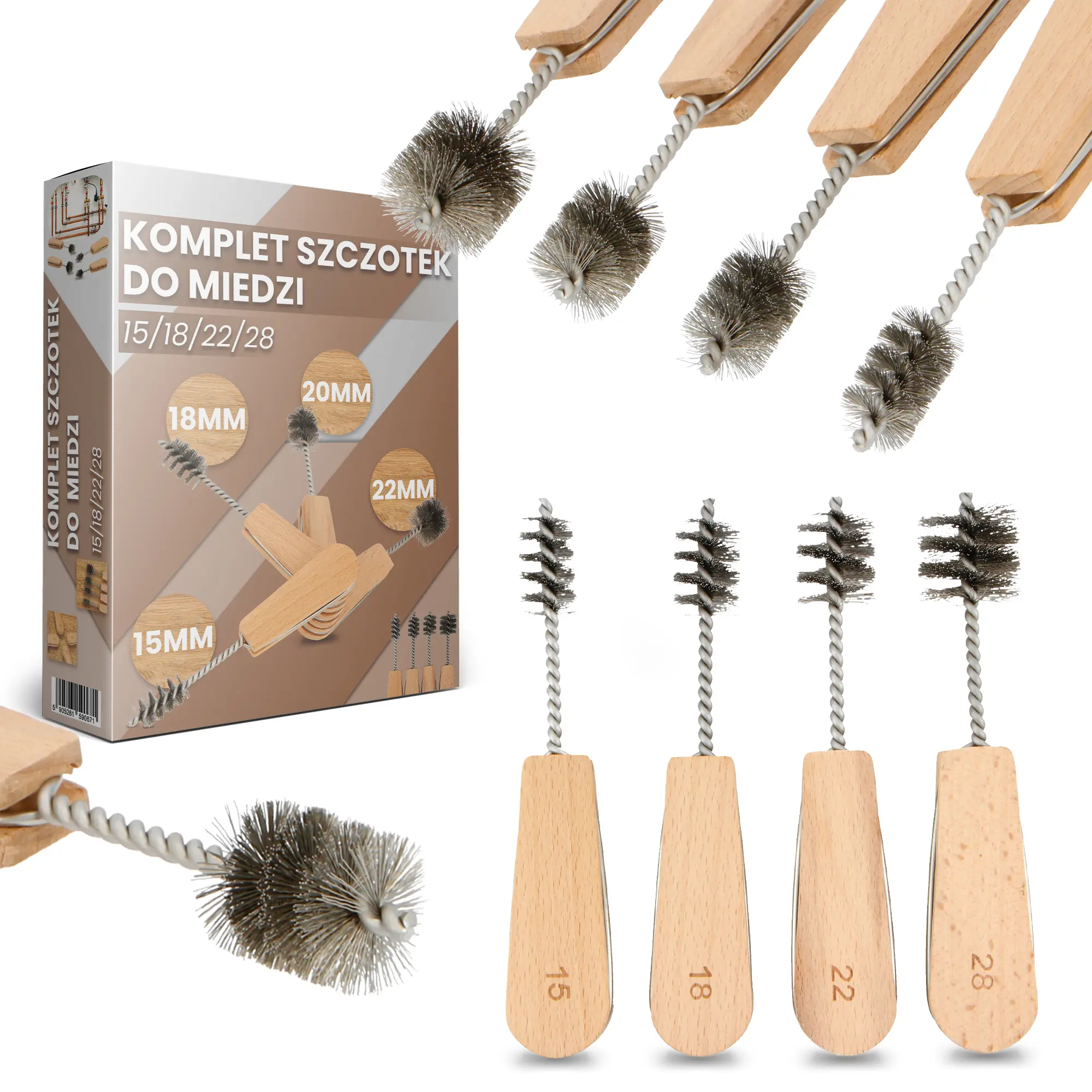 W zestawie znajdują się cztery szczotki do miedzi w różnych rozmiarach. Dzięki temu bez trudu zadbasz o różne rodzaje powierzchni i dopasujesz akcesorium do wielkości powierzchni czyszczonej.