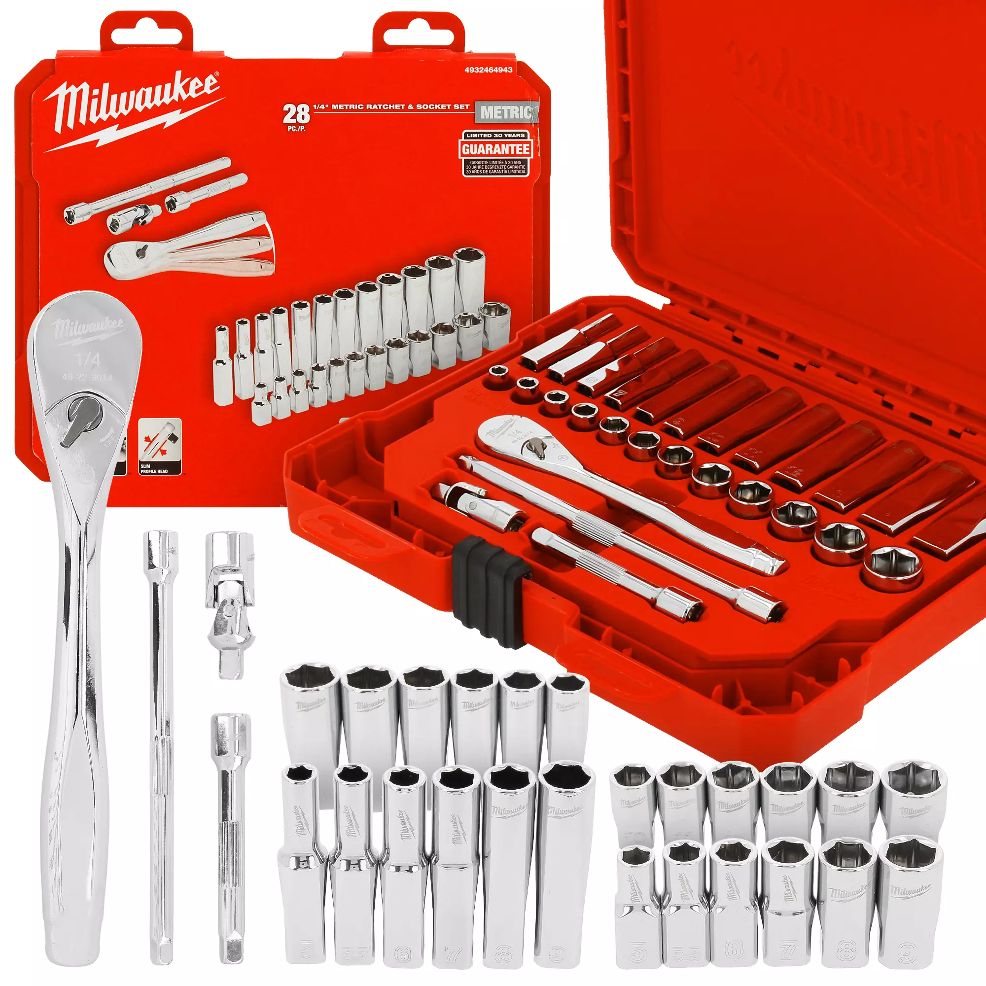 W zestawie znajdziesz nasadki standardowe i długie, grzechotkę, przedłużacze i przegub.
