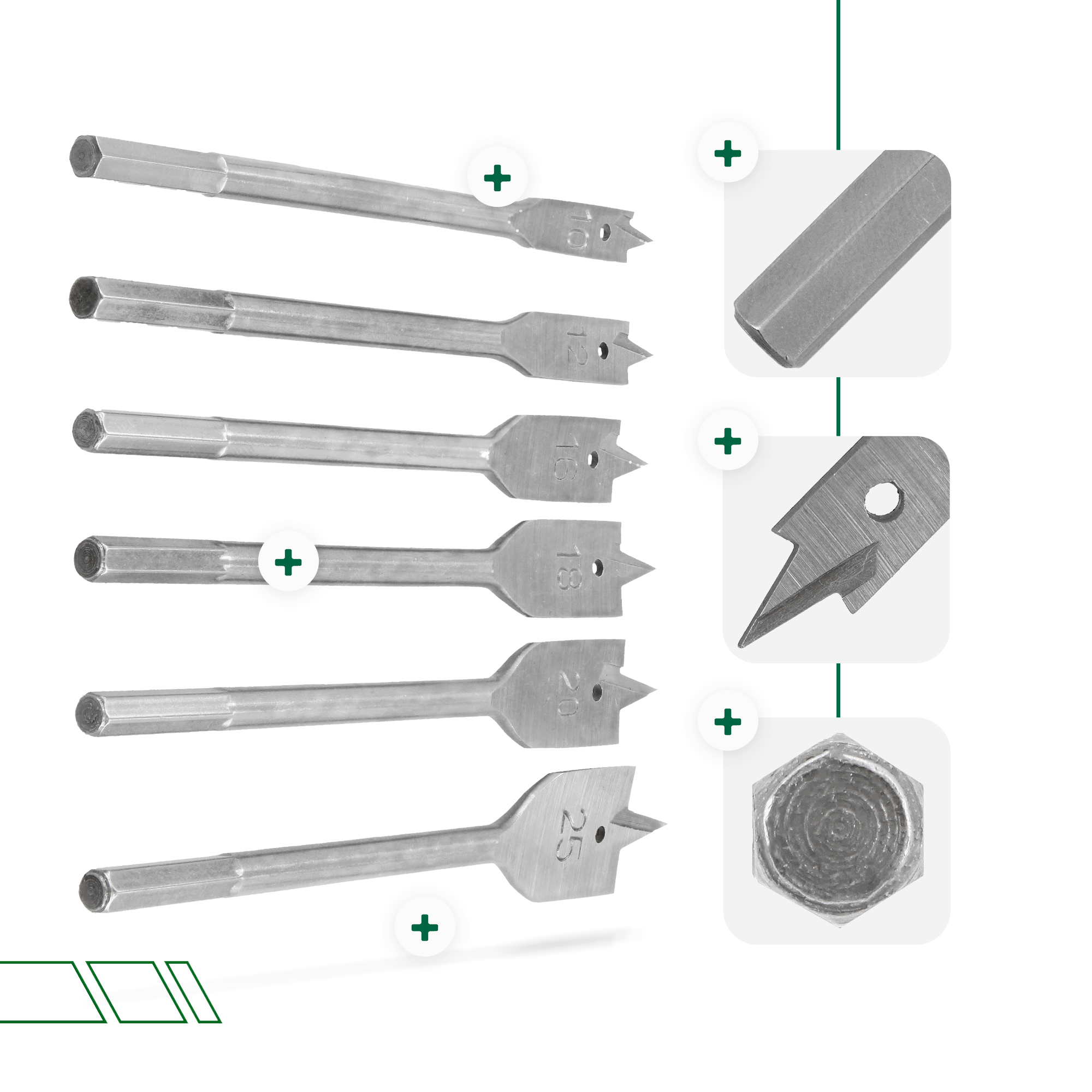 Każde z wierteł wyposażono w uniwersalną końcówkę sześciokątną. Dzięki temu zastosujesz je w praktycznie każdym elektronarzędziu dostępnym na rynku.