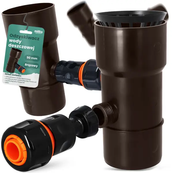 Odzyskiwacz wody deszczowej 90 mm x 1'' GZ brązowy z przyłączem pod szybkozłączke 1'' GW x SZ PowerJet i szybkozłączka 1'' W x SZ PowerJet
