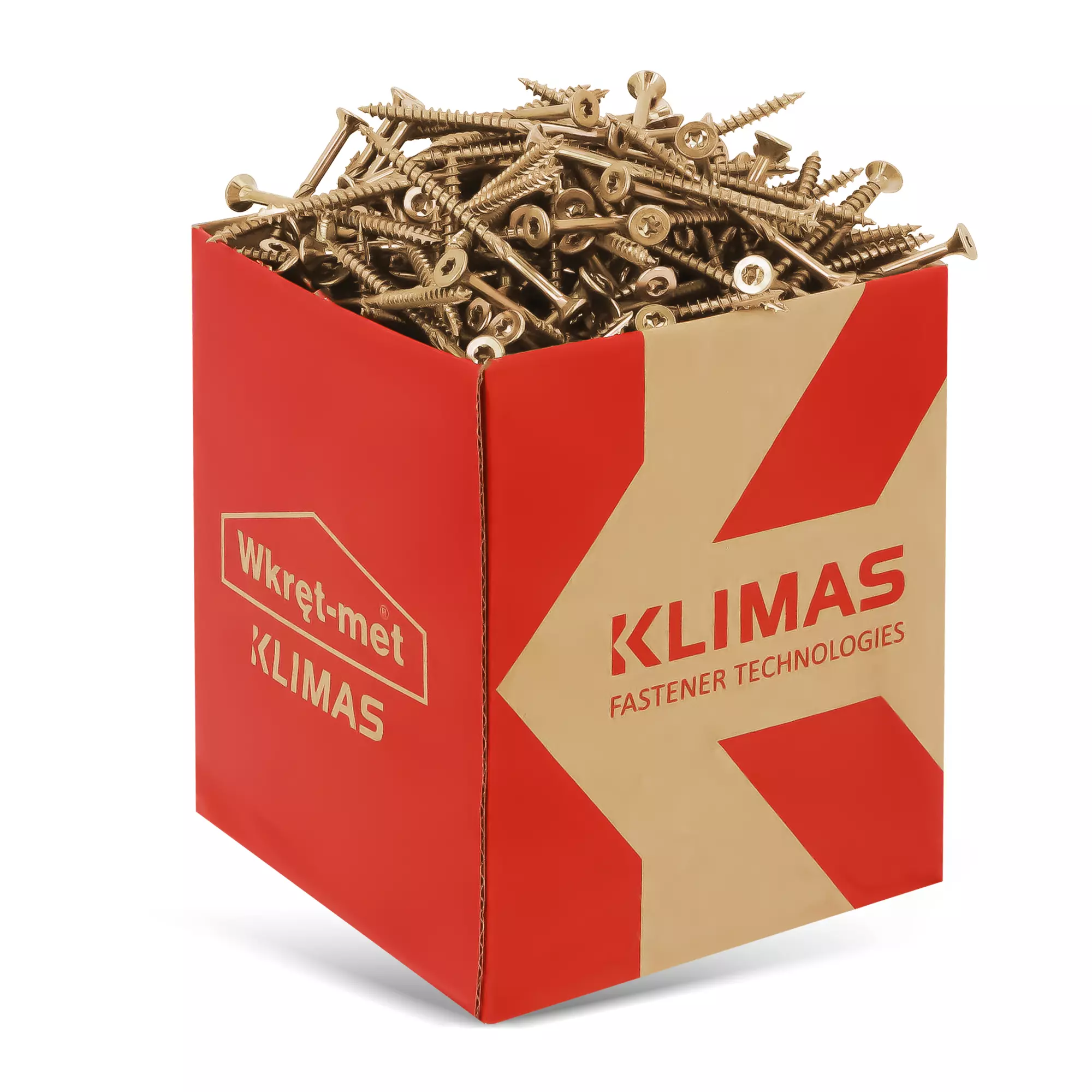 Frez rozwierający umieszczony w połowie długości śruby poszerza otwór i zmniejsza opór materiału o około 20%. Dzięki temu wkręt łatwiej zagłębia się w drewnie. Stożkowy łeb wyposażony w specjalne wypustki zapewnia estetyczne wykończenie, bez wystających krawędzi.