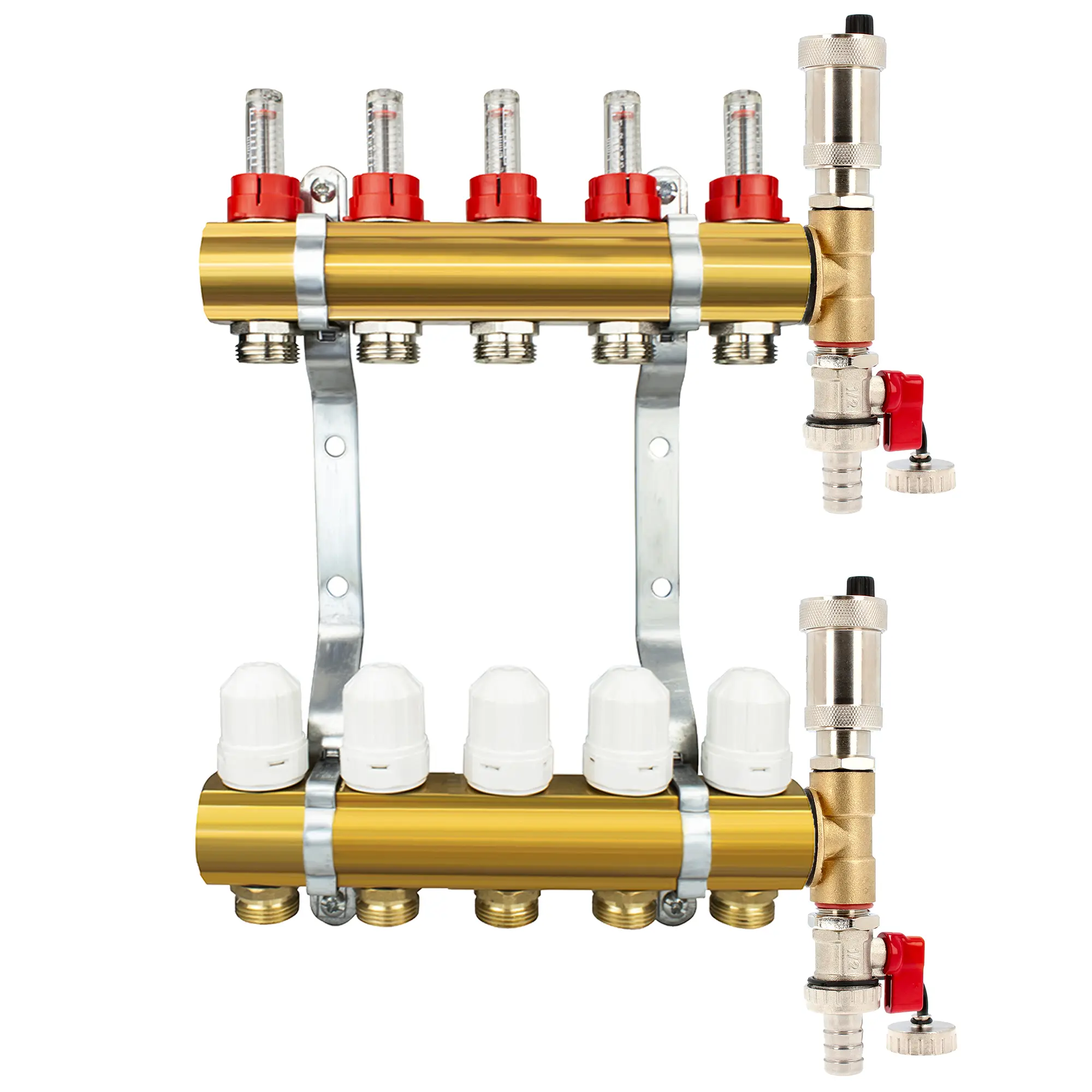 Rozdzielacz CO mosiężne do podłogówki - uzbrojony (adaptery PEX, odpowietrzniki automatyczne, trójniki, zawory spustowe) 5 obwodów