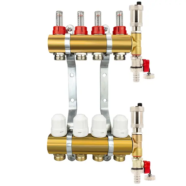 Rozdzielacz CO mosiężne do podłogówki - uzbrojony (adaptery PEX, odpowietrzniki automatyczne, trójniki, zawory spustowe) 4 obwody