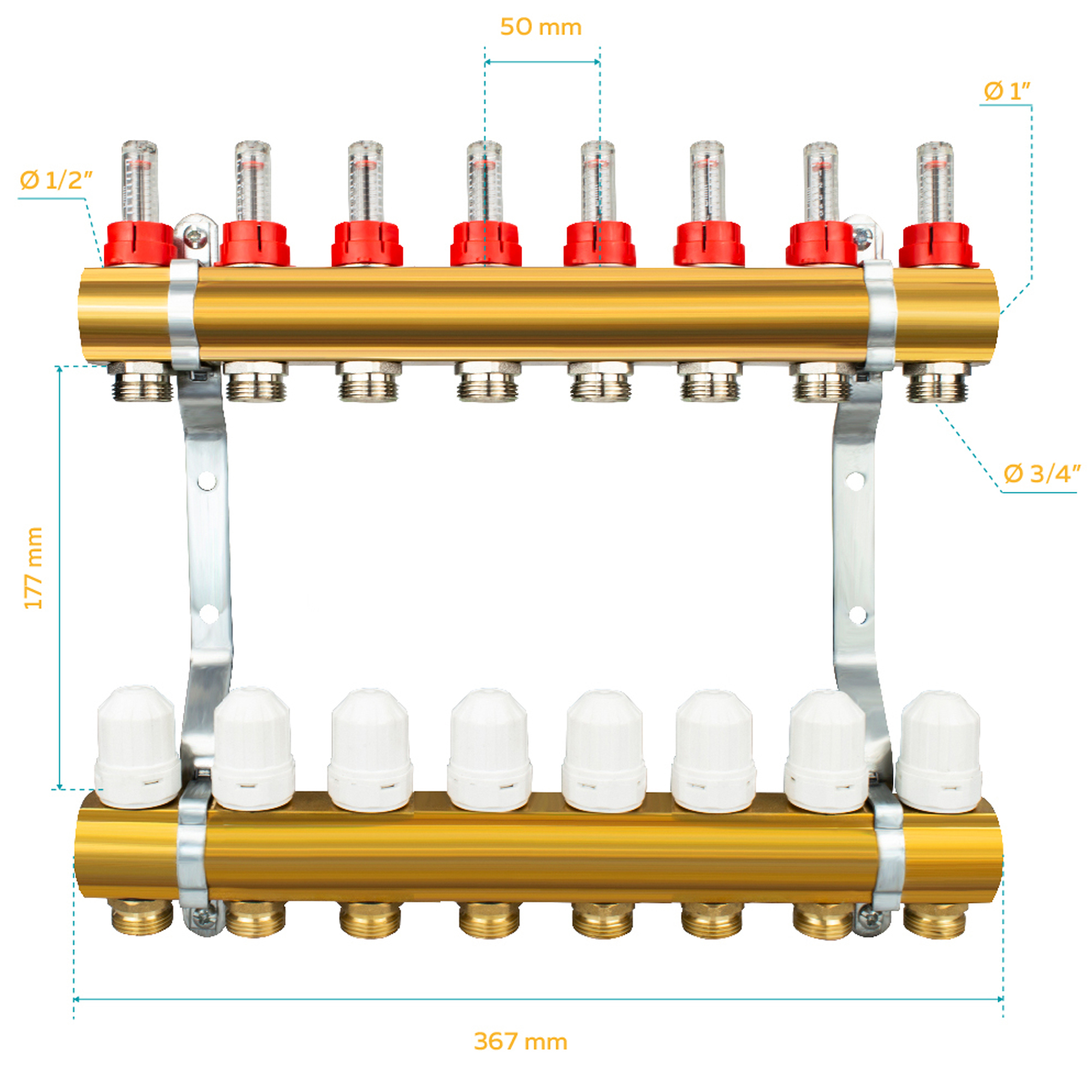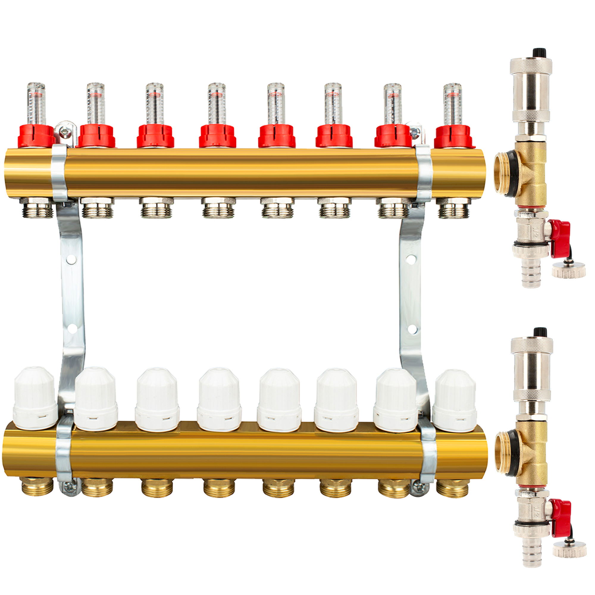 Rozdzielacz CO mosiężne do podłogówki - uzbrojony (adaptery PEX, odpowietrzniki automatyczne, trójniki, zawory spustowe) 8 obwodów | Kup Online!
