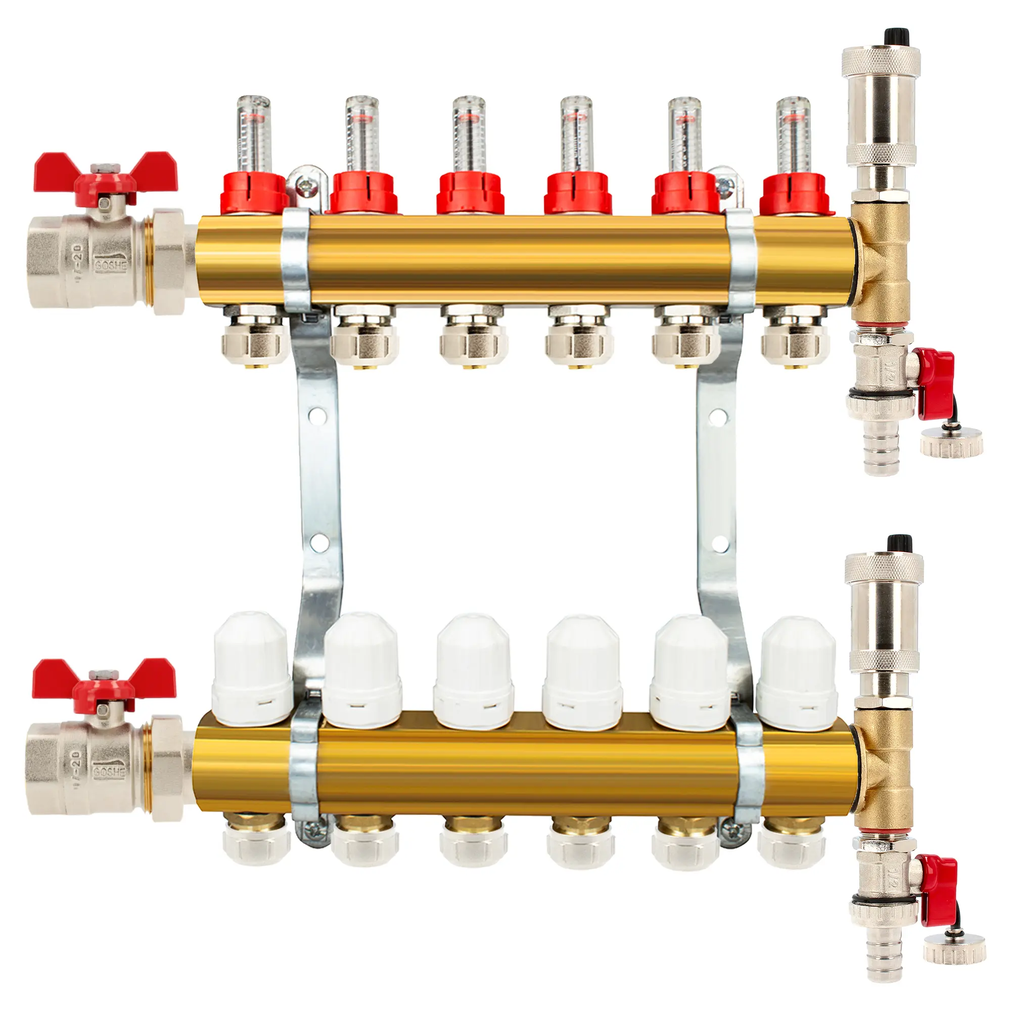 Rozdzielacz CO mosiężny do podłogówki - uzbrojony 6 obwodów