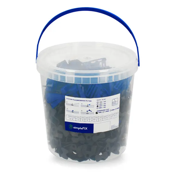 Zestaw Simplefix składa się z 500 sztuk klipsów oraz 100 sztuk klinów. Elementy te wykorzystywane są podczas układania glazury na ścianach i podłogach wewnątrz budynku.