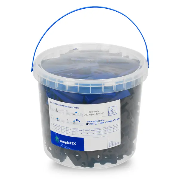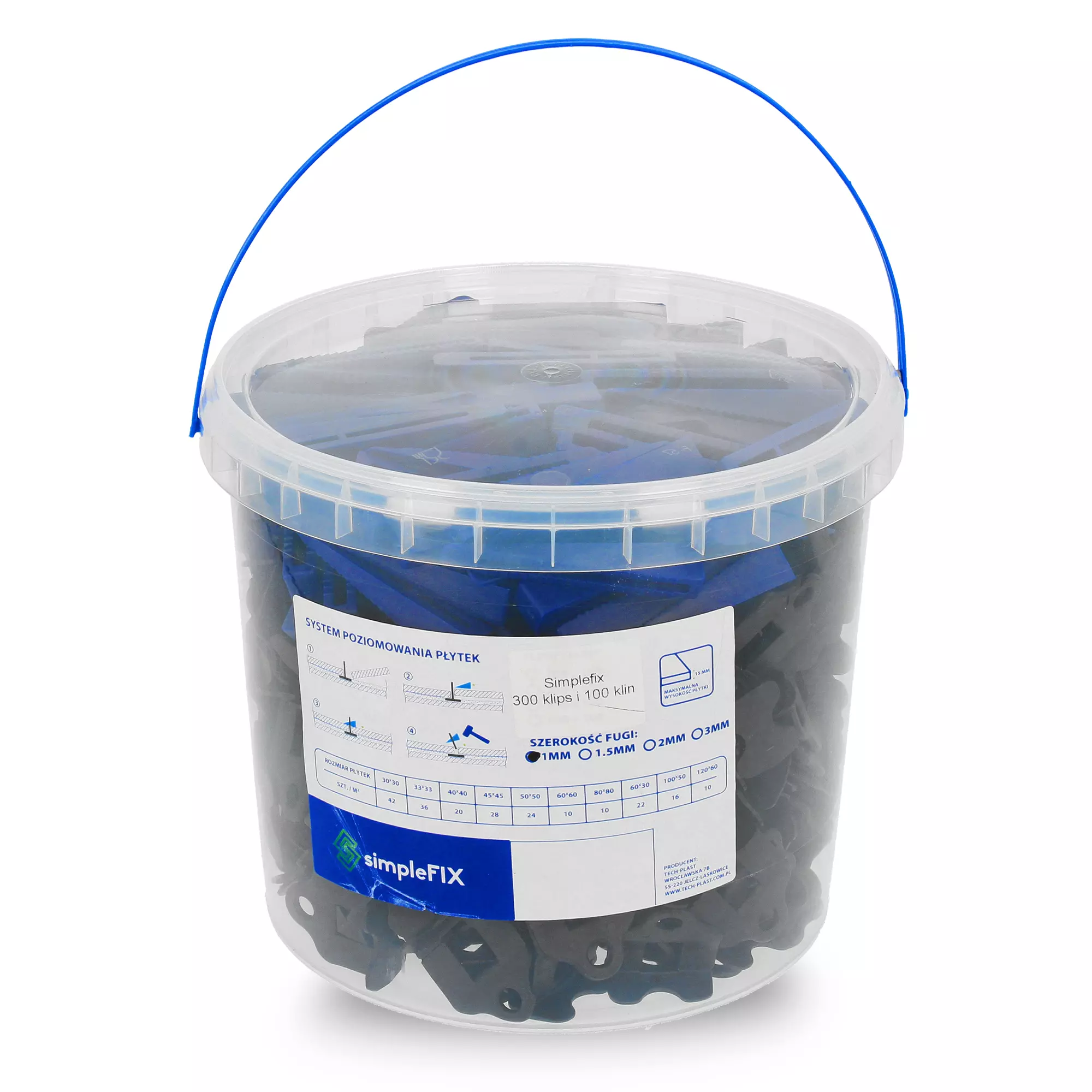 Zestaw Simplefix składa się z 500 sztuk klipsów oraz 100 sztuk klinów. Elementy te wykorzystywane są podczas układania glazury na ścianach i podłogach wewnątrz budynku.