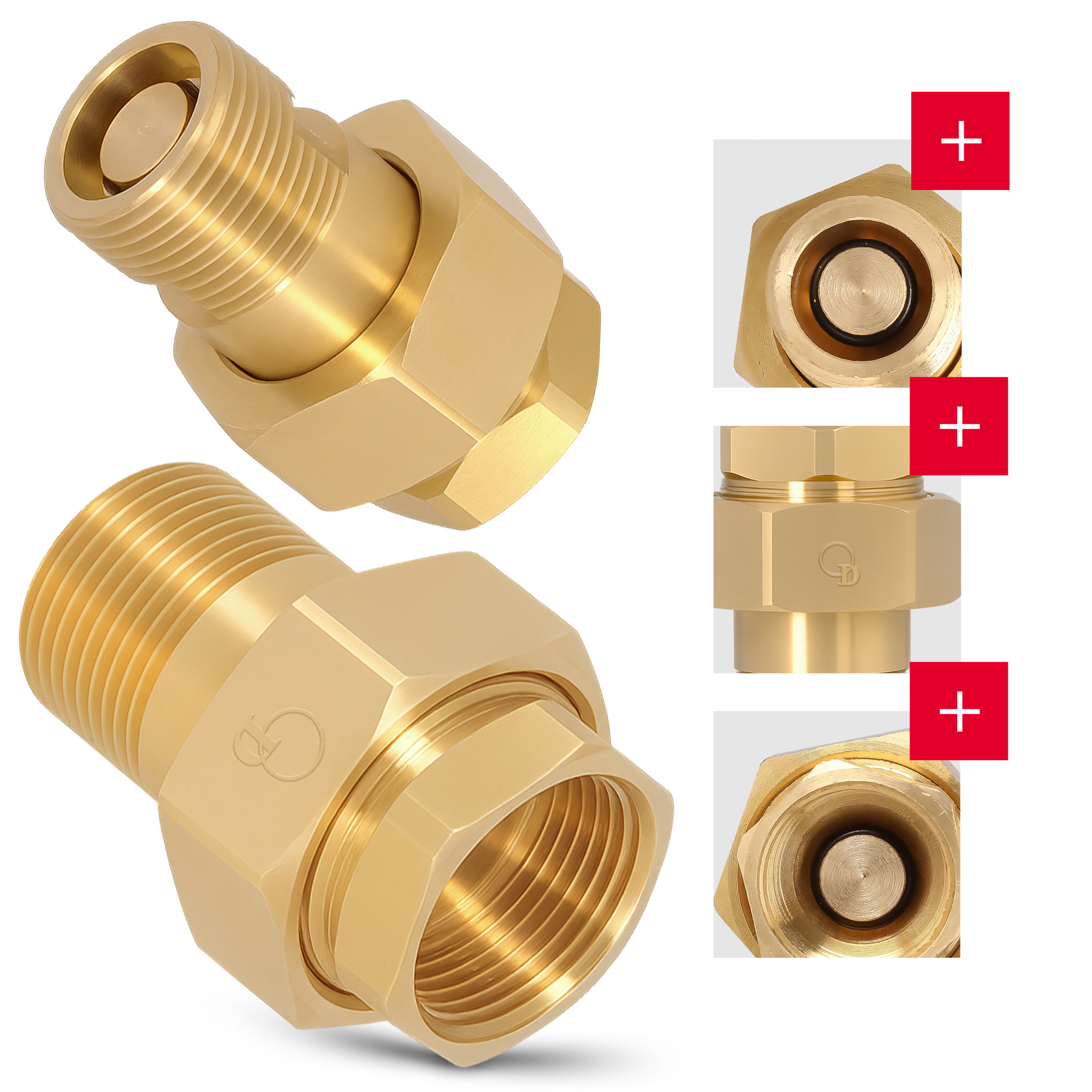 Produkt wykonany z mosiądzu stanowi element łączący używany w systemach c.o. i wodociągowych. Umożliwia szybkie rozłączanie i łączenie przewodów oraz podzespołów w instalacji. Śrubunek z zaworami zwrotnymi ogranicza potrzebę stosowania dodatkowych zaworów, co oszczędza miejsce i czas pracy.